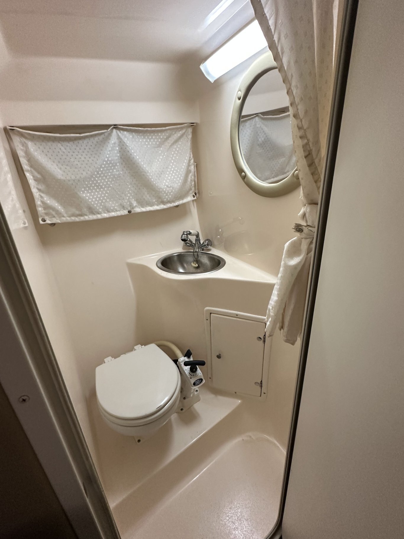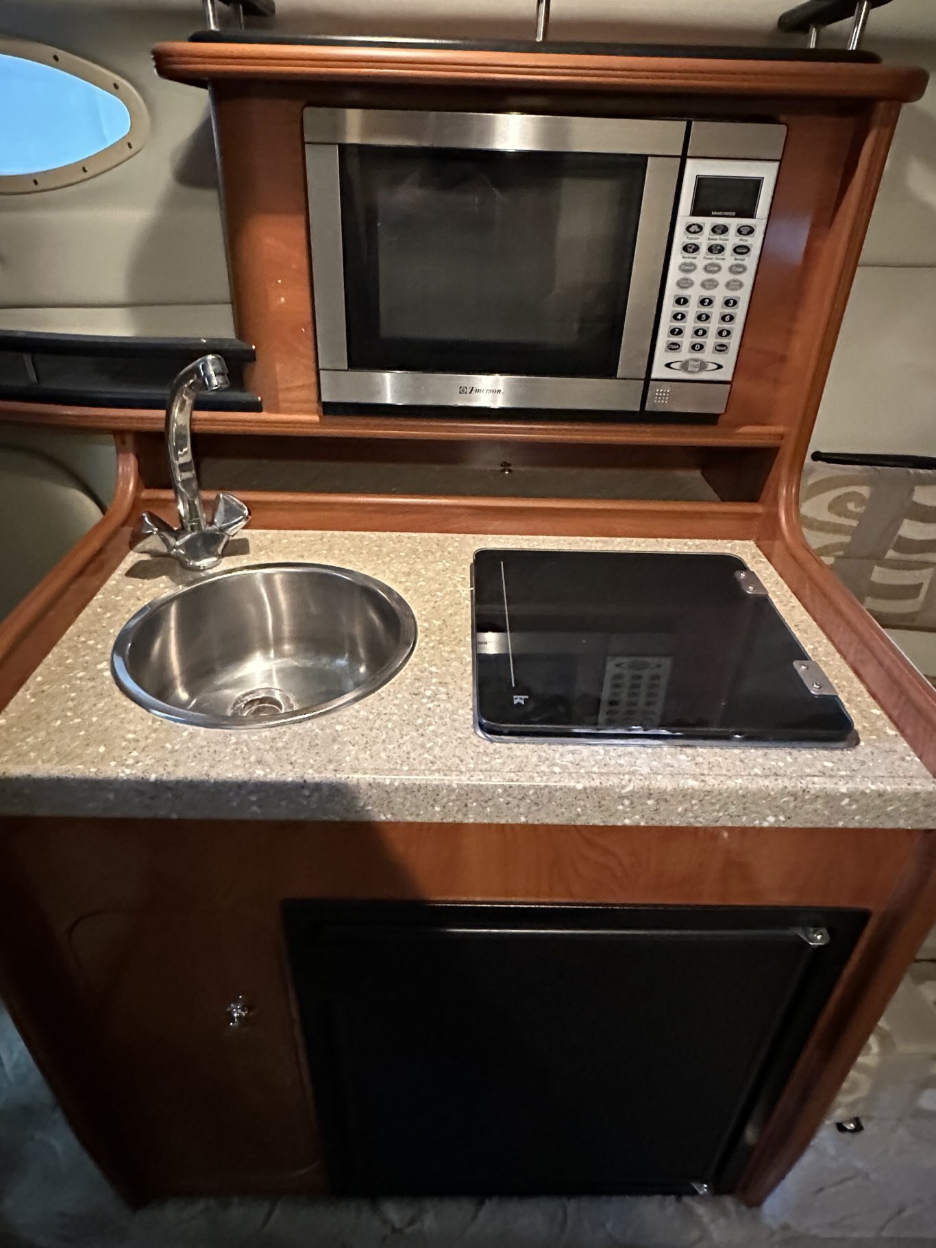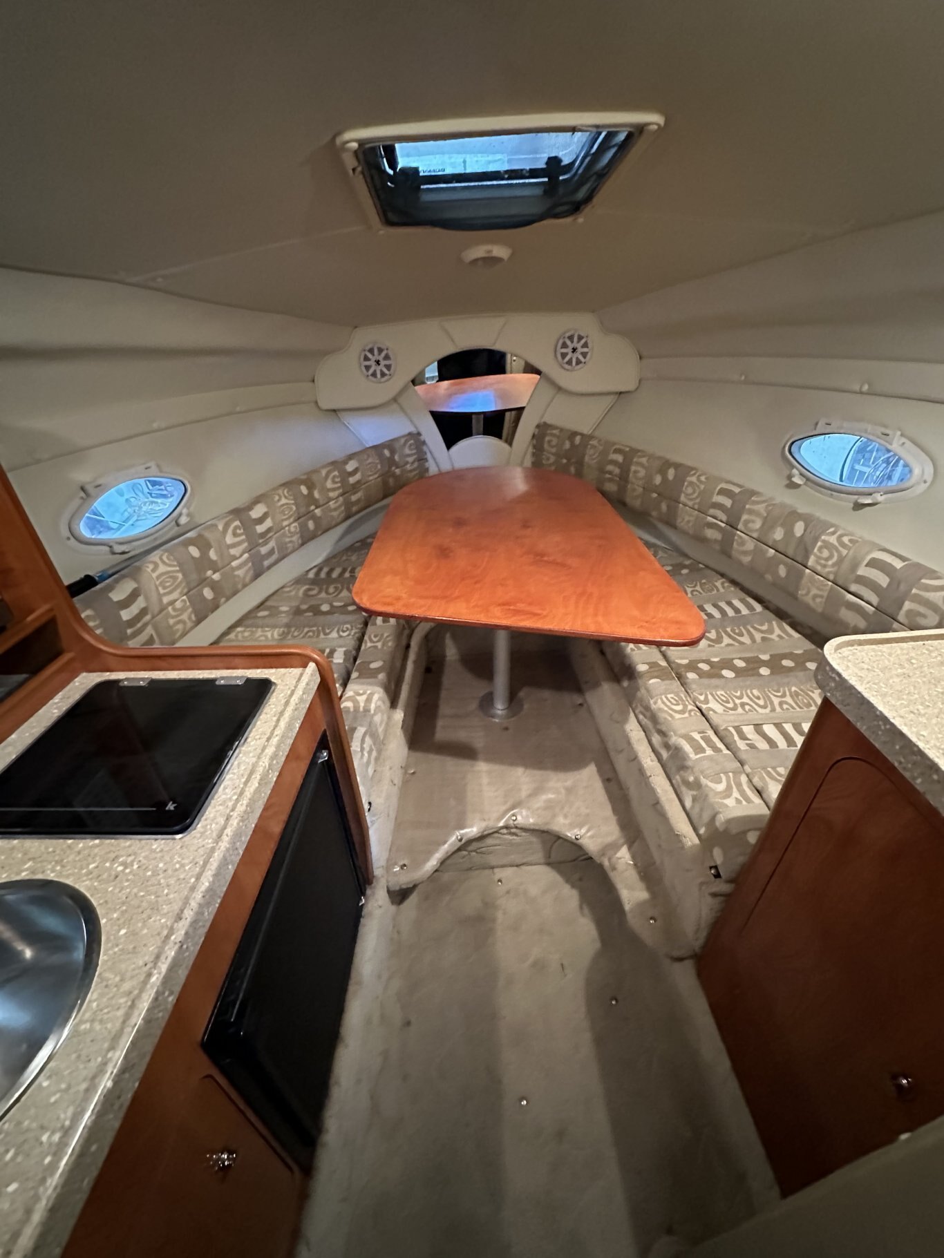 Below deck, the cabin layout makes overnighting easy and comfortable. The forward berth converts into a dining table, and there is an additional aft berth for guests. The enclosed wet head provides privacy, and the galley is equipped with a sink, microwave, fridge, and electric/alcohol stove for meal prep on the water.