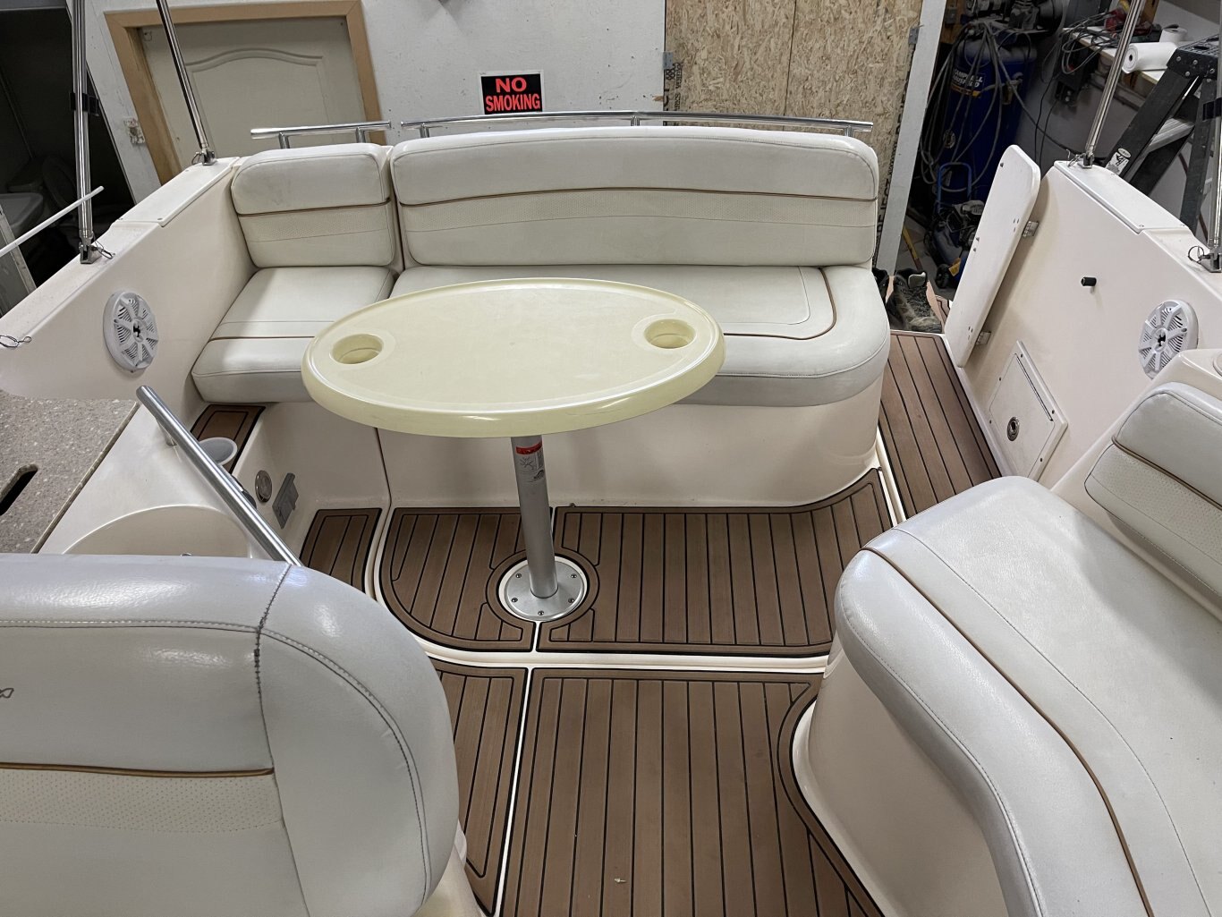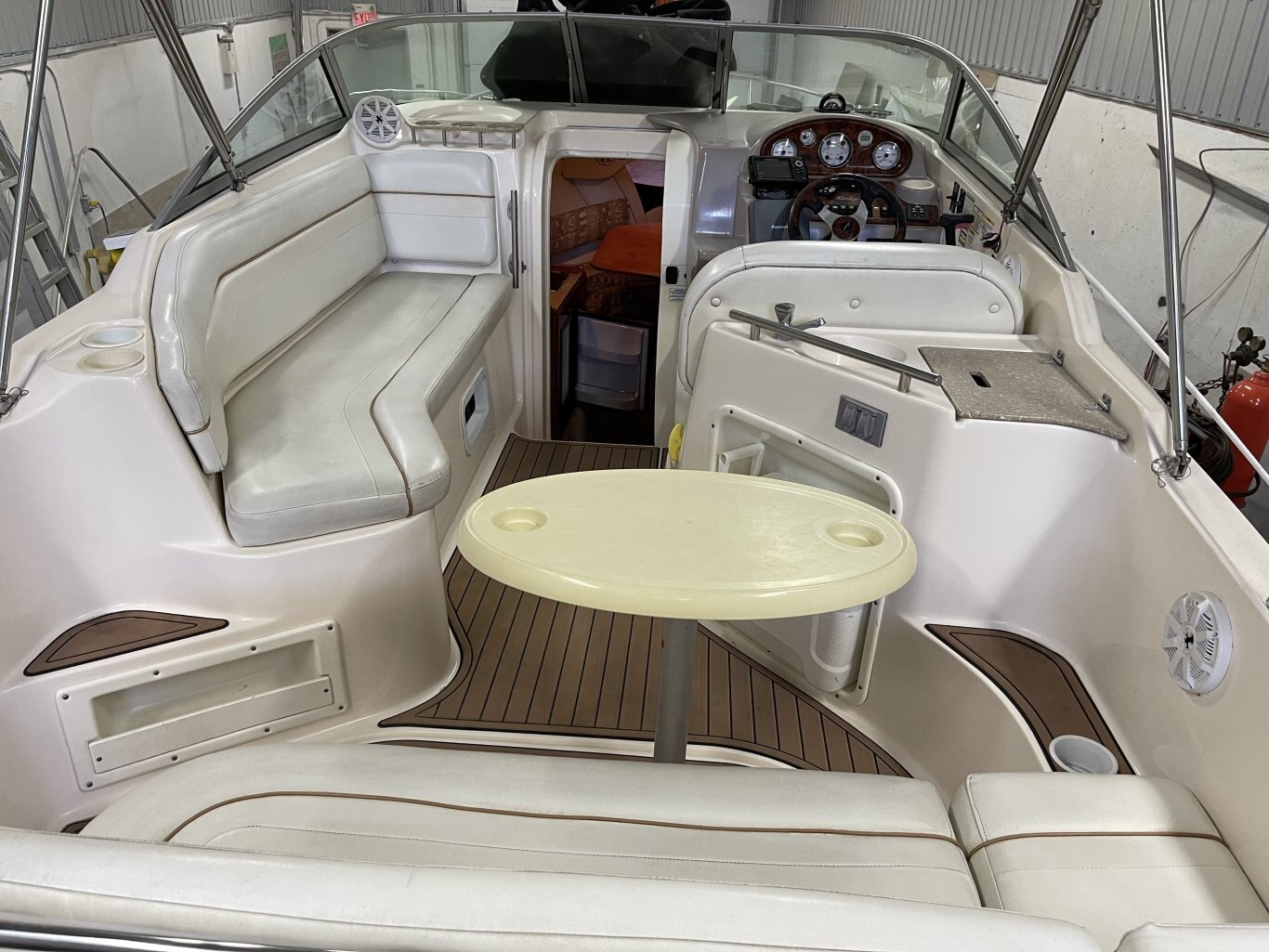 The cockpit is designed for comfort and entertaining, featuring SeaDek flooring, comfortable seating for six, and a wet bar with a removable cooler. There’s a removable cockpit table for dining or drinks at anchor, along with shore power, a transom shower, and a stereo syste. Navigation is handled by a Raymarine chartplotter and fishfinder. The boat also includes a camper top, bimini top, and mooring cover to keep you protected in all weather conditions.