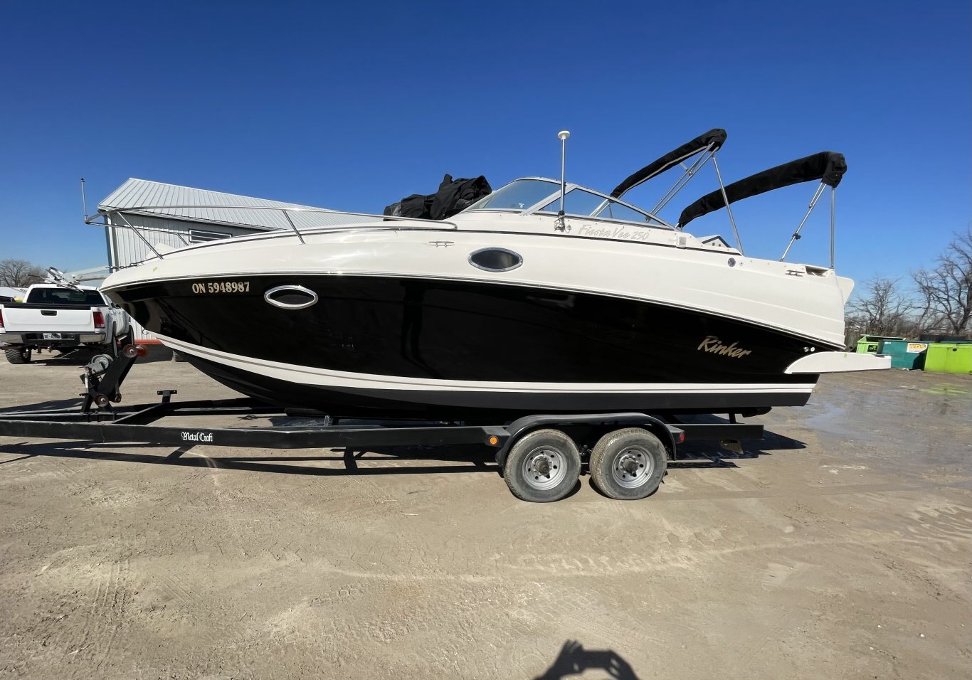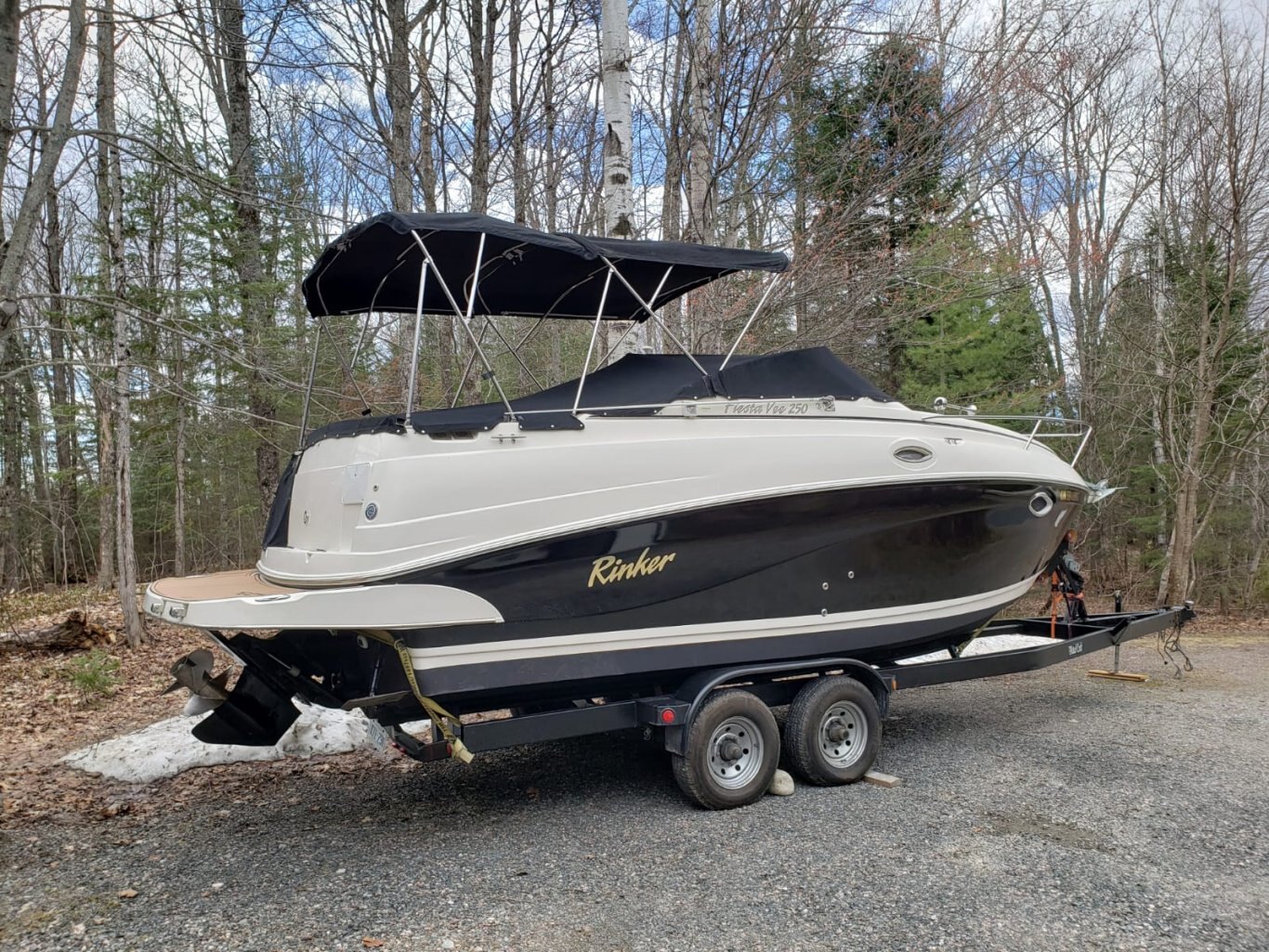 This 2005 Rinker 250 Fiesta Vee is a clean, well equipped express cruiser that’s ready for its next owner. Powered by a MerCruiser 350 MAG MPI engine with approximately 500 hours and paired with a Bravo drive, this boat offers dependable performance and smooth handling. With trim tabs and a depth finder onboard, she’s set up for the afternoon or heading away for the weekend. The boat measures 27’1” LOA with an 8’6” beam and has a dry weight of 6,350 lbs. It also comes with a matching tandem axle trailer, making transport and storage simple.